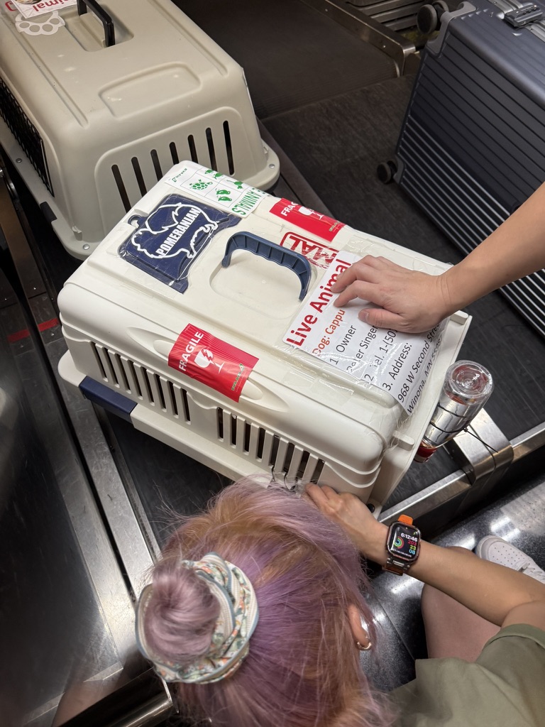 We flew EVA Air directly to Chicago — each flight only allows up to 5 pets, so we literally took the last available spots! 😆