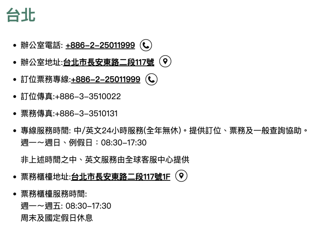 長榮客服電話:+866-2-25011999 (資料來源:長榮航空官網)