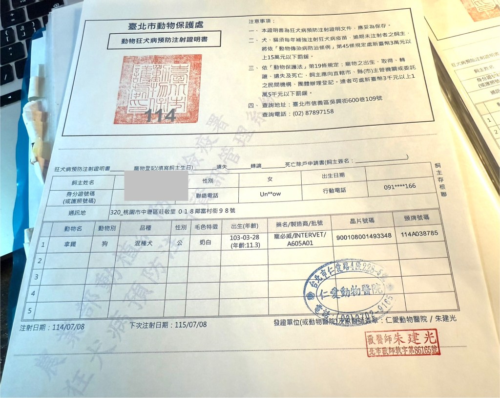 ✳️ 小提醒: 狂犬病疫苗施打後要保存好動物醫院開立的「狂犬病預防注射證明」,上面必須清楚標註晶片號碼、日期與獸醫簽名。