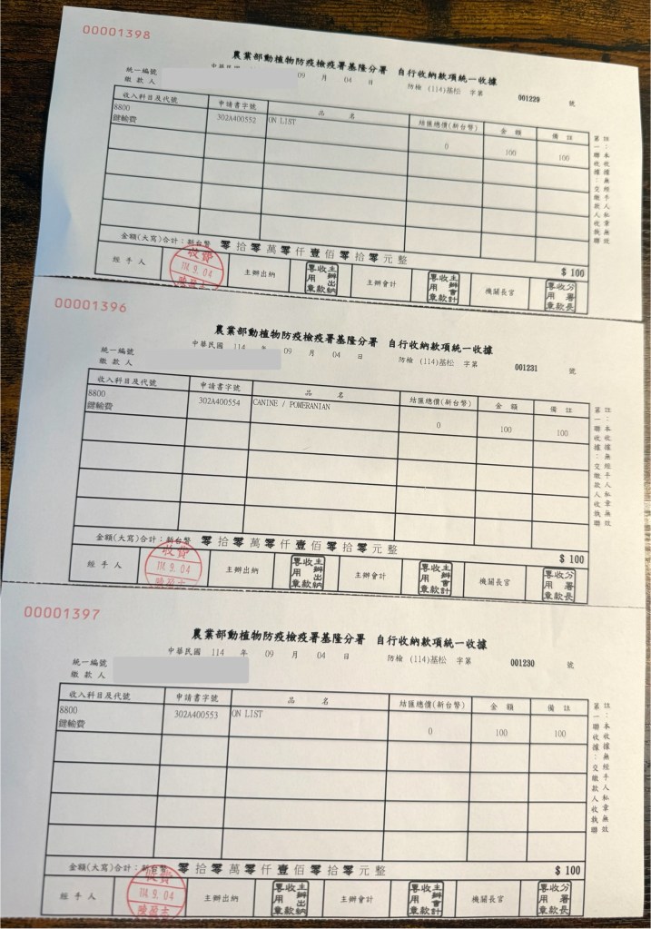We scheduled both the health certificate and quarantine process on the same day — in the morning at Ren-Ai Animal Hospital, and in the afternoon at the Animal and Plant Quarantine Office at Songshan Airport.