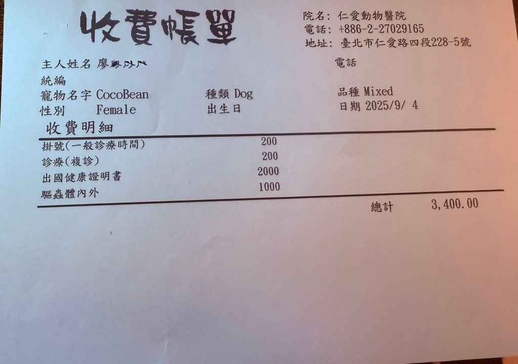 附上我家Cocobean 2次去仁愛動物的費用單明細